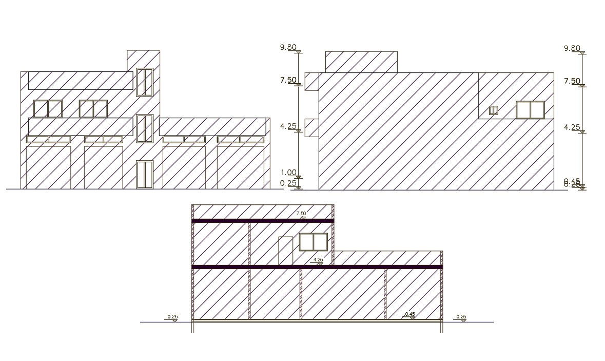 AutoCAD drawing of shop with building design that shows retail shop on ground floor and top floor house building design. also has front elevation shop shutter and window marking detail. use download DWG file of house building design.