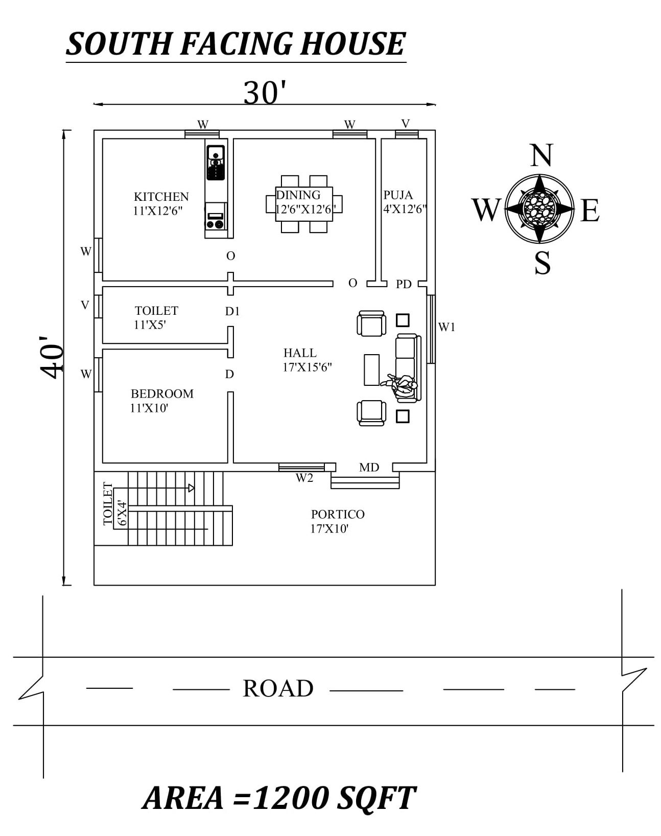 Autocad Drawing file shows 30'x40' 1bhk South facing House Plan As Per Vastu Shastra. The total buildup area of this house is 1200 sqft. The kitchen is in the Northwest direction. Dining near the kitchen placed in the North direction. The Hall is Placed in the Southeast direction. The master bedroom is available in the southwest direction. The common toilet is in the west direction. The puja room is in the northeast direction. A staircase is available in the southwest outside of the house. The Toilet is available under the staircase.Portico/Car parking is available in the Southeast direction of the house. Road Available in the South direction.Download Autocad Drawing file and PDF file.
