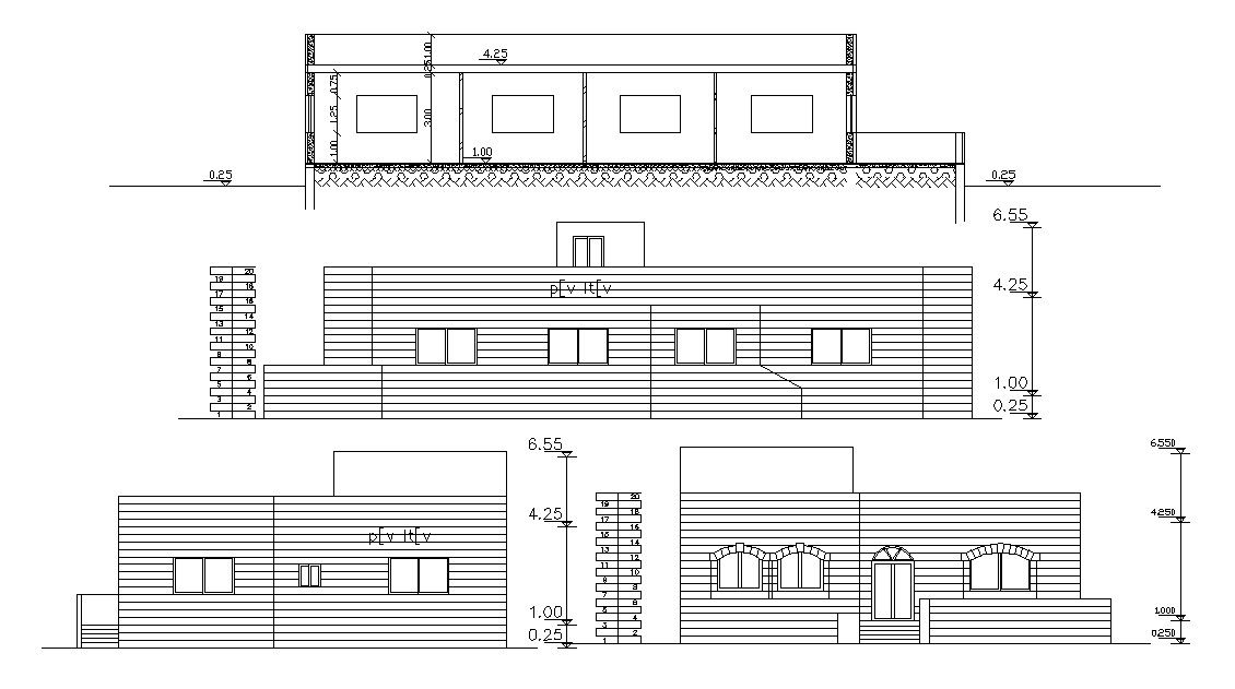 Residence single storey bungalow Elevation and sectional CAD drawing that shows bungalow different sides of elevation design with levelling details, download AutoCAD Drawing for free.