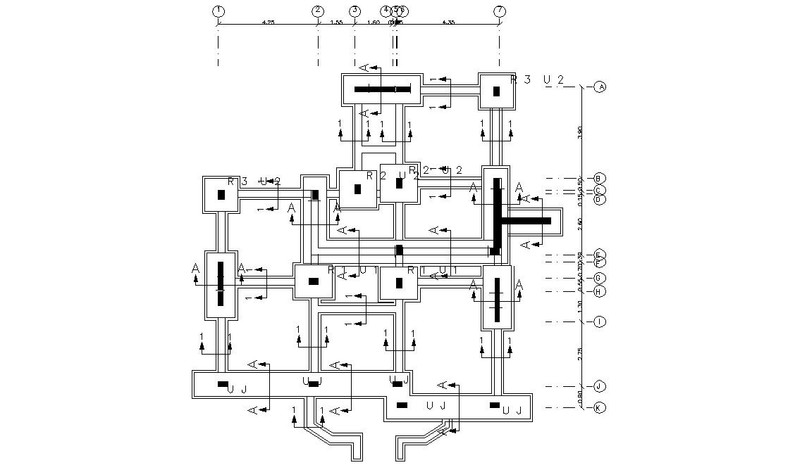 CAD presented drawing for column pile footing design that shows square and rectangular footing details for long and short column along with column size details, column spacing, column grid lines, and various other structural work details. Download AutoCAD drawing of RCC column layout arrangement center line plan.