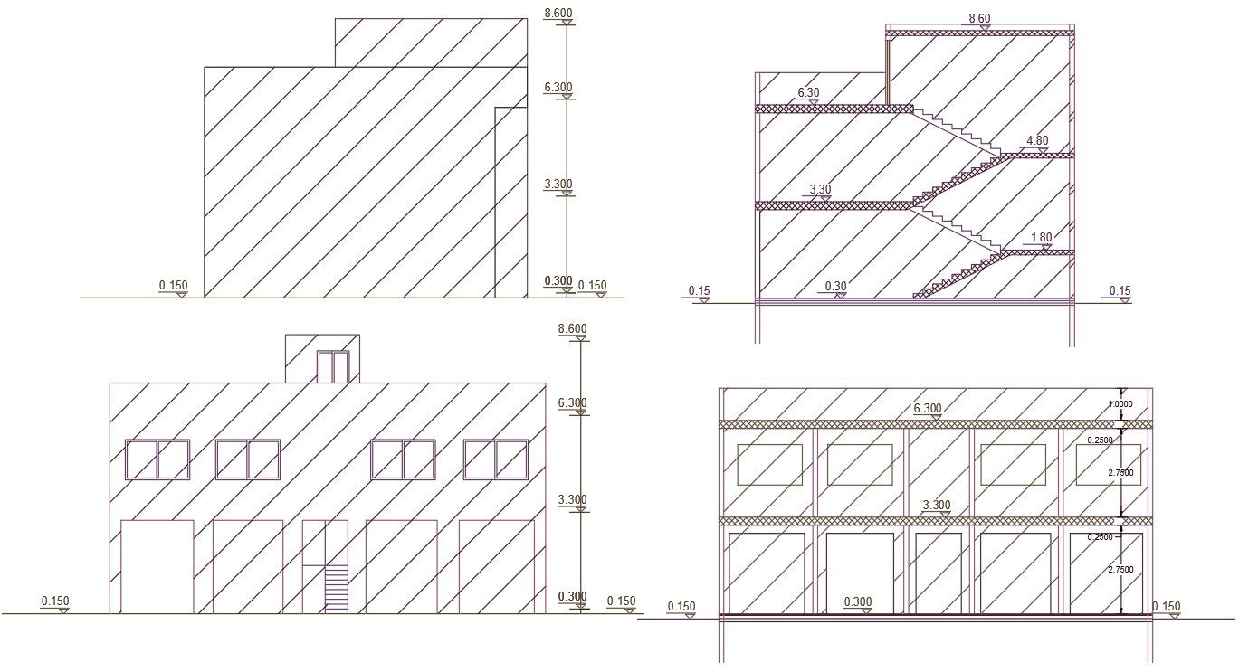 AutoCAD drawing of Commercial shop building front and side view building sectional elevation design that show 2 level floor detail with dimension. download commercial shop building design DWG file.