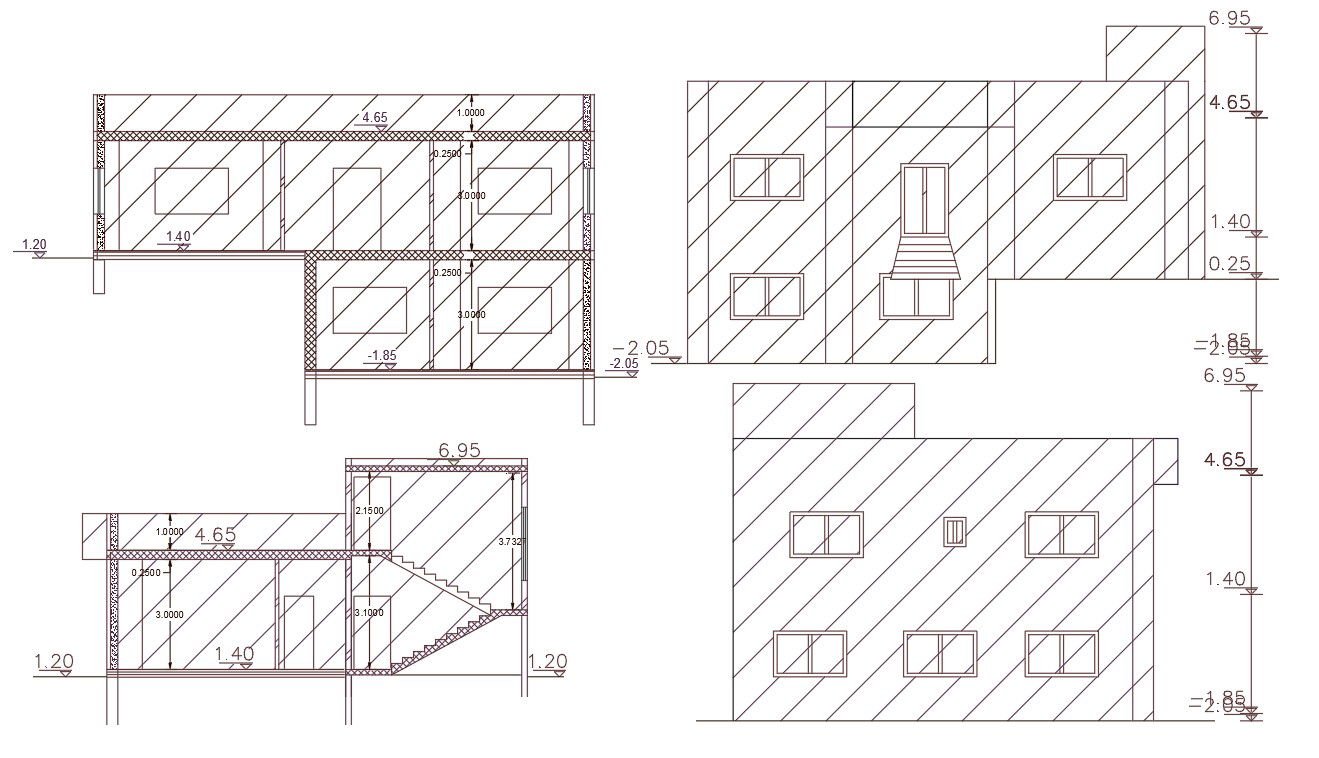 AuroCAD drawing of Architecture 2 storey bungalow building front and side view sectional elevation design that shows door and window marking annotation with dimension detail. also has some AutoCAD hatching design for improving CAD presentation.