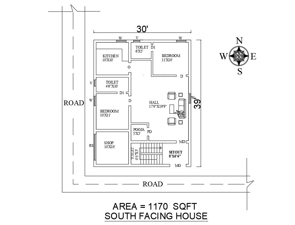 30'x39' feet 2 BHK House layout Plan .The total buildup area of this house is 1170 sqft. This shows kitchen is in the Northwest direction. The Hall Placed ,master bedroom with attached toilet, kid's bedroom with the attached toilet is in the north. The Shop is in the southwest outside of the house.staircase outside of the house.The common toilet is available in the south direction under stairs. Road South and west direction.Download with DWG file
