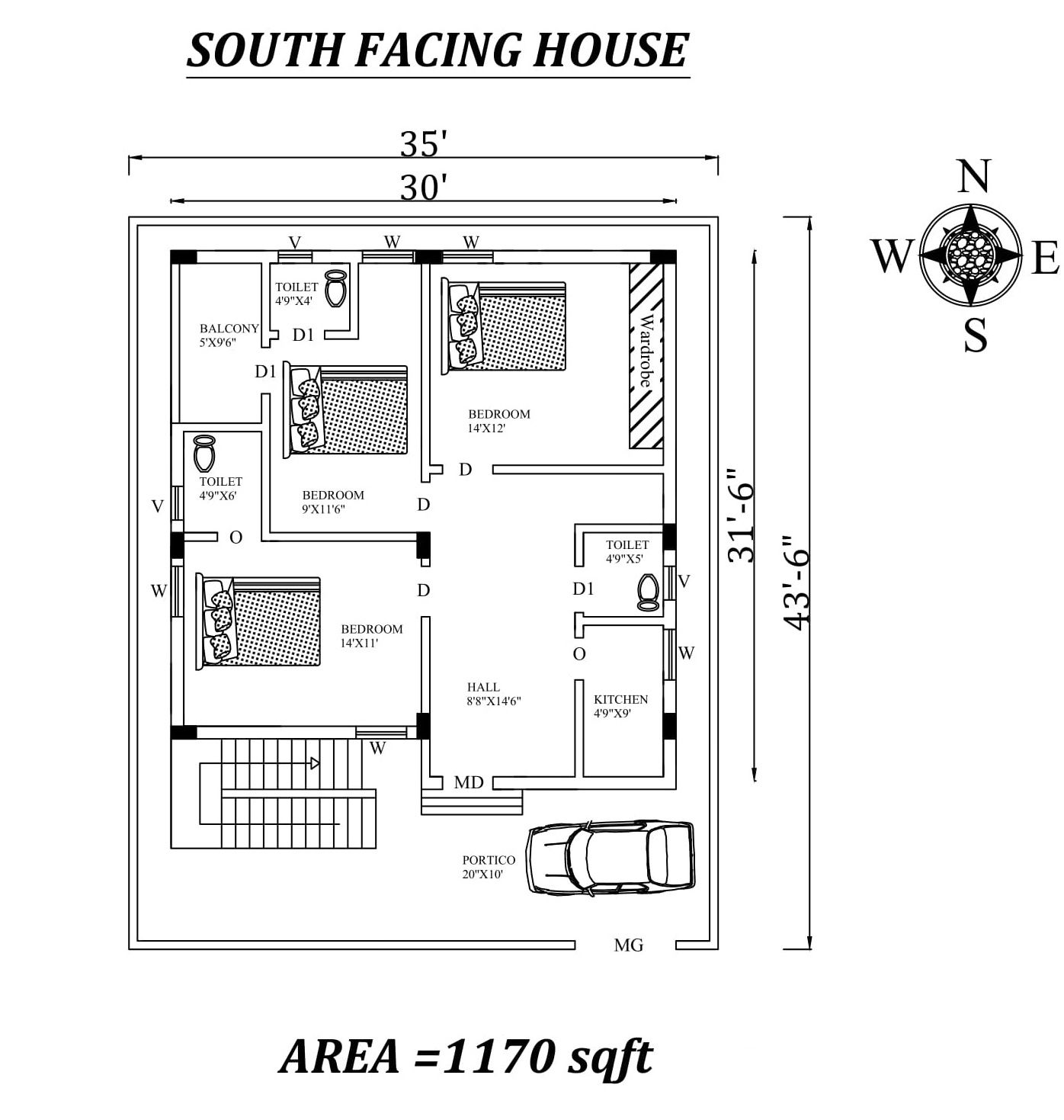 35'X43'6" 3 BHK splendid South facing House Plan The total buildup area of this house is 1170 sqft. this shows the kitchen, Hall, master bedroom with an attached toilet, guest bedroom, kid's bedroom with attached toilet, balcony. The staircase in the southwest outside of the house. The common toilet is east direction.portico of the house. Road South direction. Download the AutoCAD file.