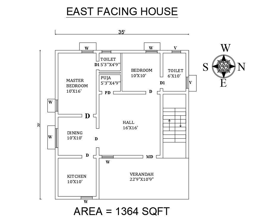 35'x39' feet East facing 2BHK house plan The Buildup area of this house plan is 1364 sqft. this shows master bedroom with attached toilet children's bedroom with attached toilet is northwest. kitchen placed in the southeast. The Dining room near Puja room, Hall,verandah, Staircase direction. Download for AutoCAD file