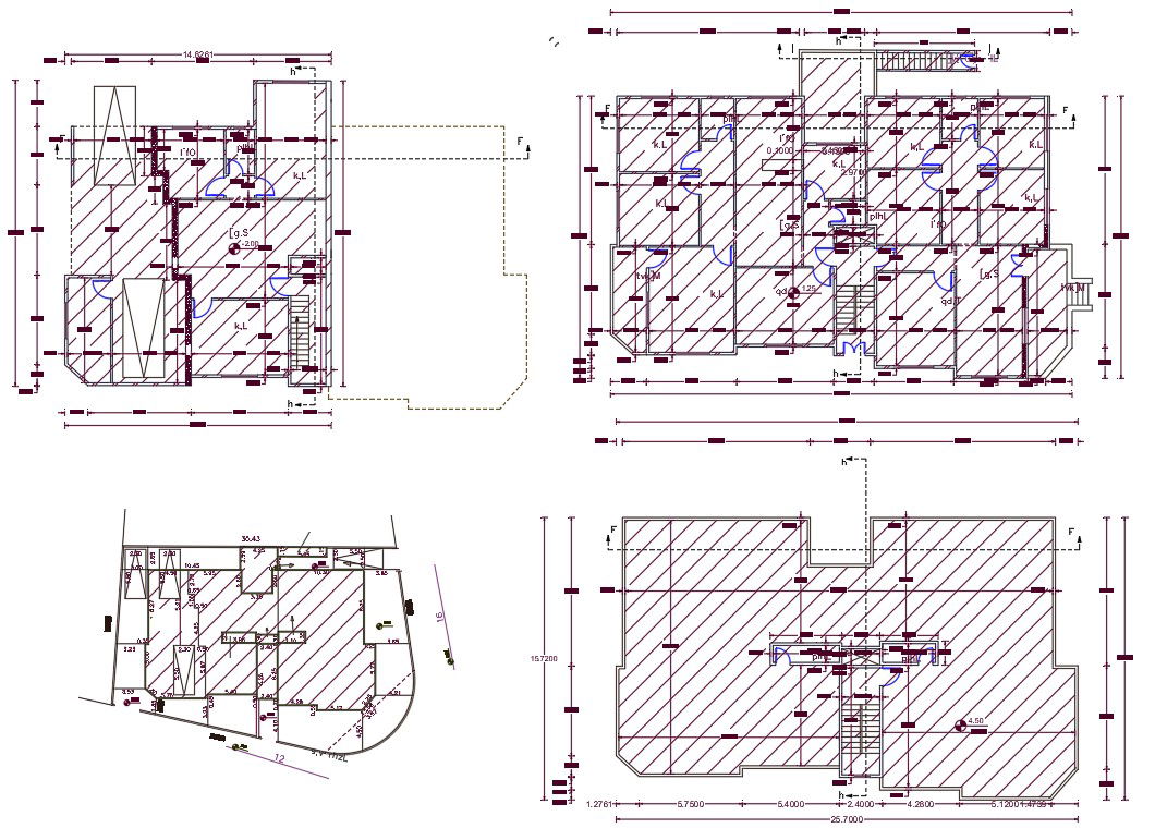 this is 3 unit residence dual house floor plan design AutoCAD drawing includes 2 BHK and 3 BHK house plan with dimension detail and door annotation. download dual house floor plan design DWG file.