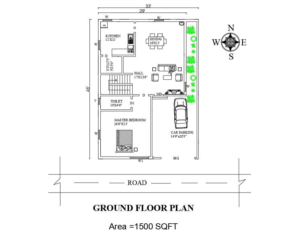 33'x46' Super Duplex South facing First Floor House Plan AutoCAD file