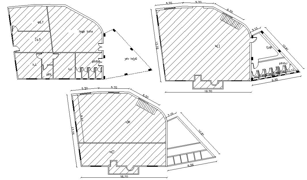 2d CAD drawing details of building layout floor plan that shows basic floor hatching along with building floor level, room details, sanitary toilet area, dimension set, and various other blocks details. Download architecture building layout plan for free.