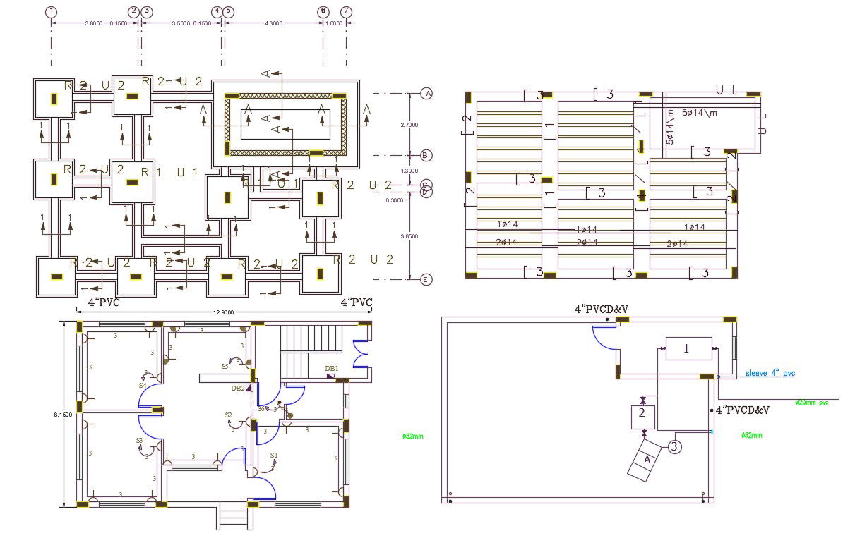 26 by 42 feet plot size for 2 BHK house construction working plan design that shows column footing foundation plan, excavation plan and slab bar structure design with center line plan detail. download house construction concrete plan with electrical plan design DWG file.