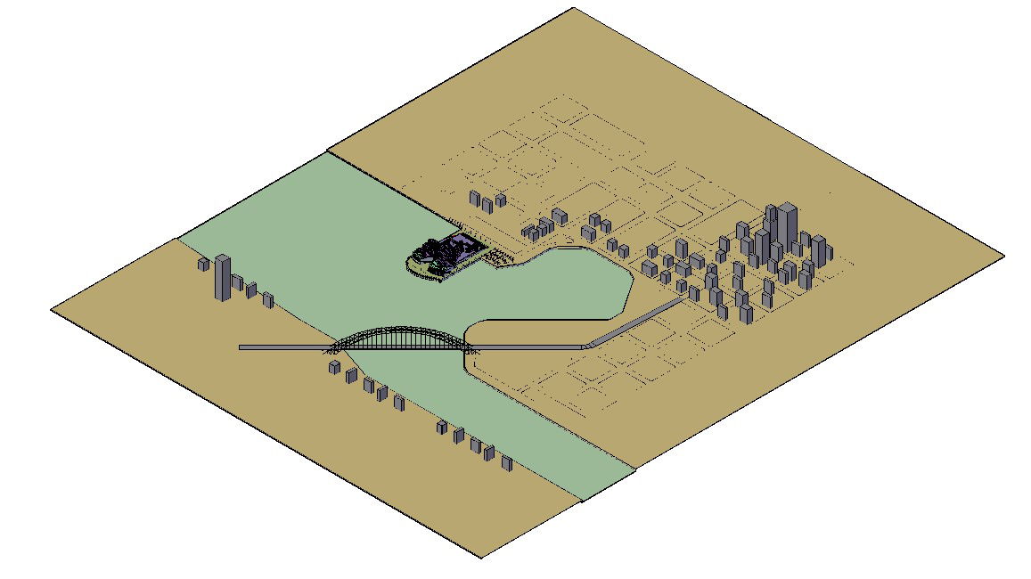 Here presents a building area design 3d model that shows isometric view design of building along with water area details, road networks, bridge, and various other unit details. Download CAD drawing for free.