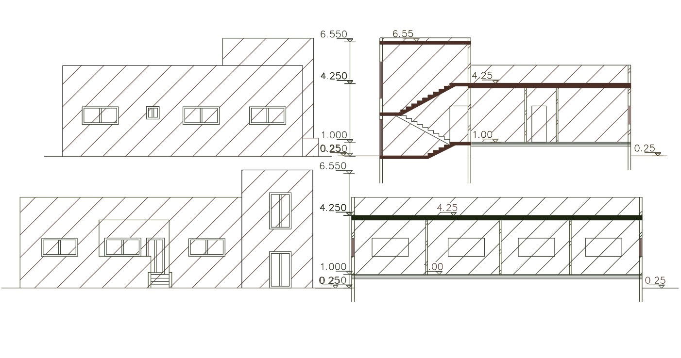 2d CAD drawing of residence house single storey floor level section drawing and elevation design that shows front and side view. download small house building design DWG file.