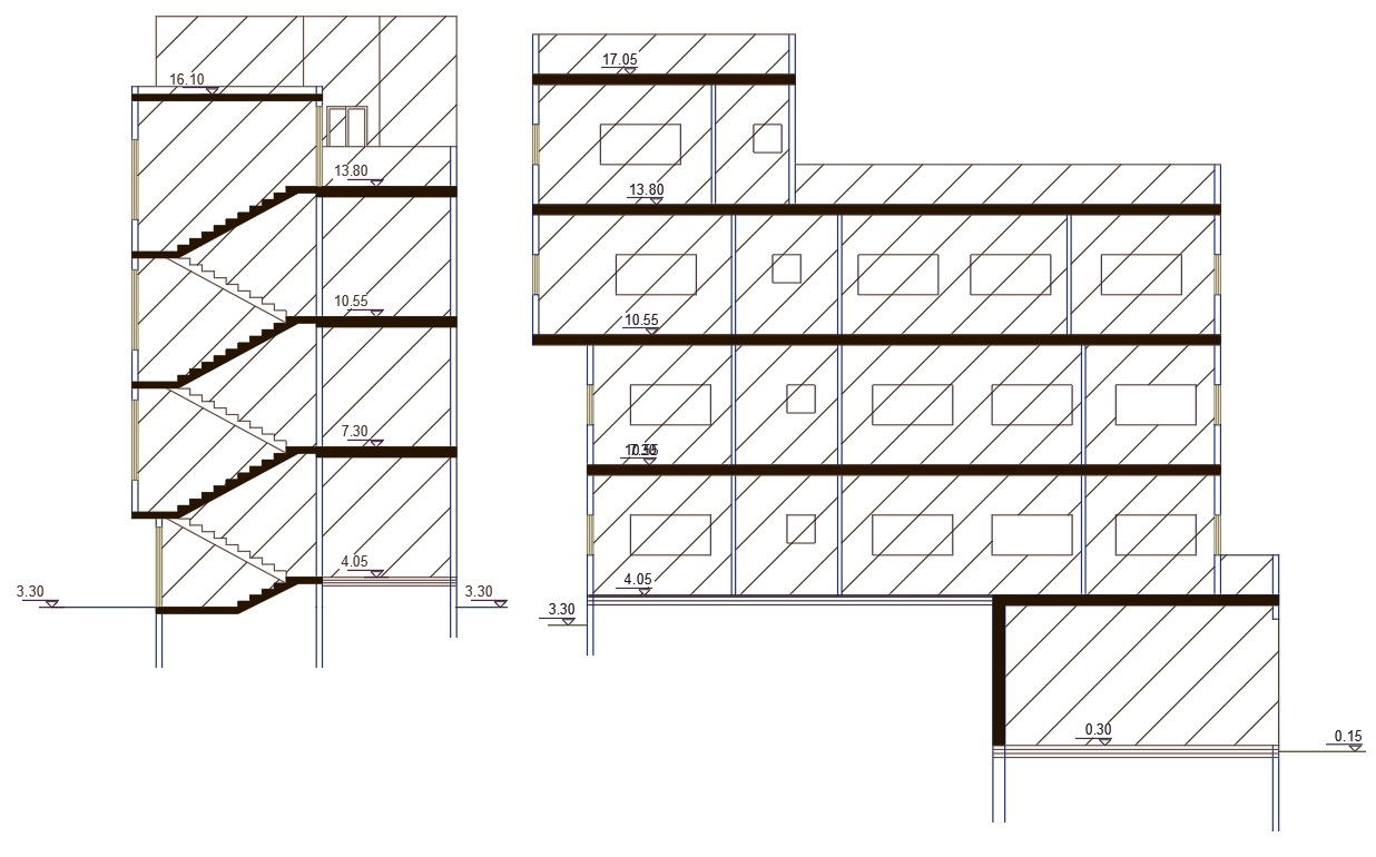 Download DWG file of 3 BHK apartment building section drawing that shows front and side view that shows RCC standard staircase and slab design.