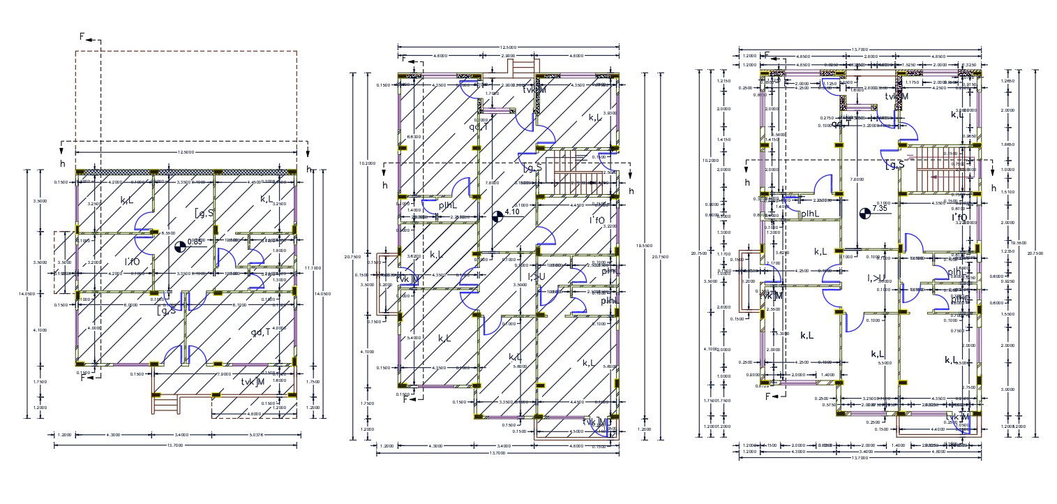 40 by 68 feet size for architecture apartment house multistory floor plan design includes 5 bedrooms, kitchen, drawing and living room with dimension detail and column layout plan. download 2720 square feet multistory house plan design DWG file.