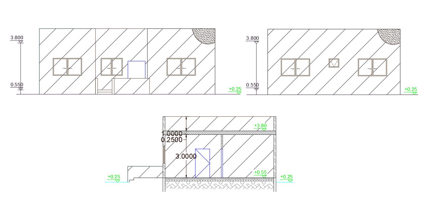 AutoCAD drawing of 2 BHK residence house building sectional elevation design with dimension detail. download 40 feet width and 30 feet depth single storey house building design DWG file.