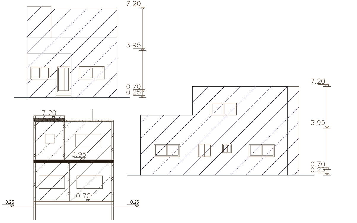AutoCAD drawing of residence house building front and side elevation design and section drawing with dimension detail. download small house building design DWG file.
