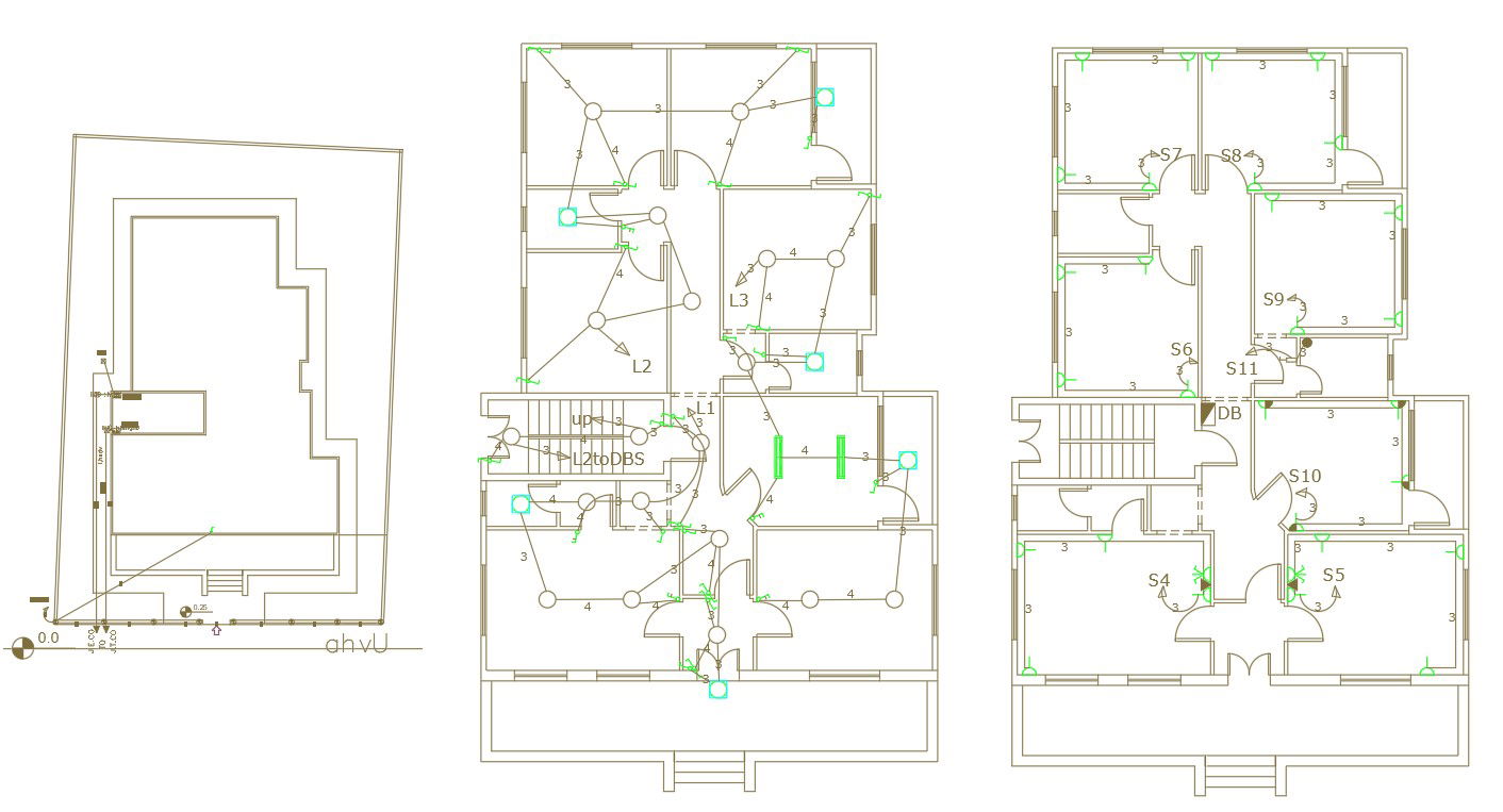 the 4 bedrooms architecture residence house electrical layout plan CAD drawing that shows the proposal plan to distribute energy and appliances around the house for proper installation wiring and the elements included in the design such as electrical light point, meter, and switches. download 4 BHK house electrical wiring plan design DWG file.