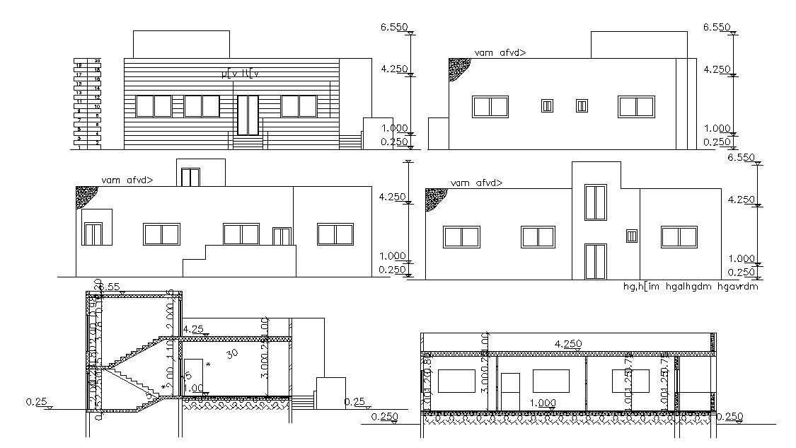 The single-storey residence house building all side elevation design and section drawing includes dimension detail and building structure design download 44 feet width and 52 feet depth of house building design DWG file.