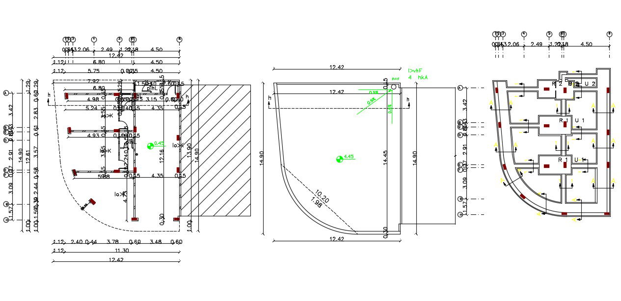 The commercial shop floor plan design CAD drawing includes a concrete working drawing that shows a column layout with centre line plan and foundation plan design. download 4 commercial shop plan drawing DWG file.