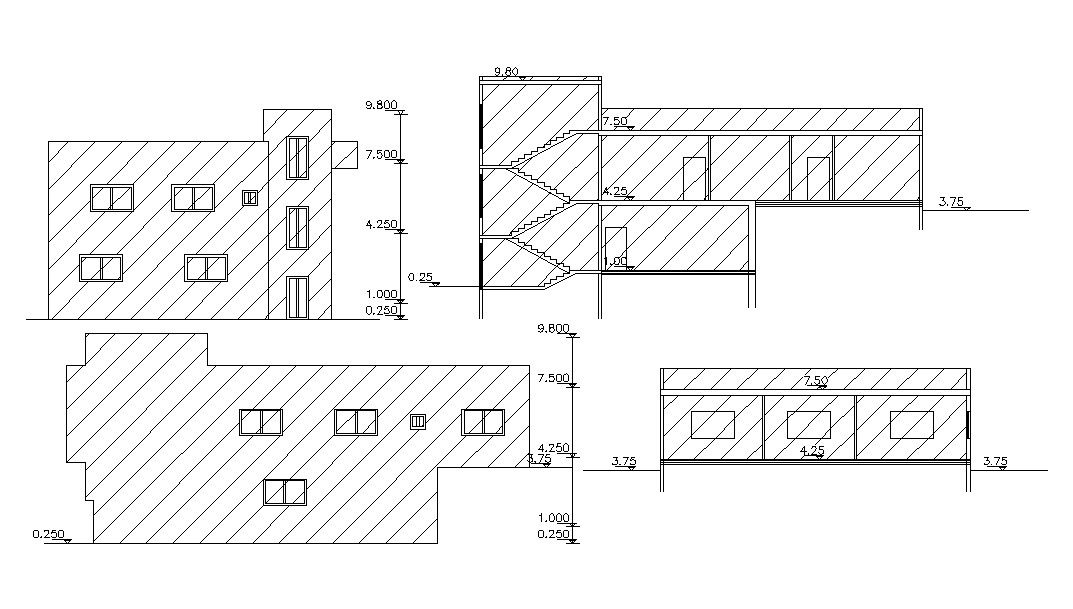 The architecture residence house building front and side view section drawing and elevation design with dimension detail. download house building design DWG file and use this drawing for AutoCAD practice.
