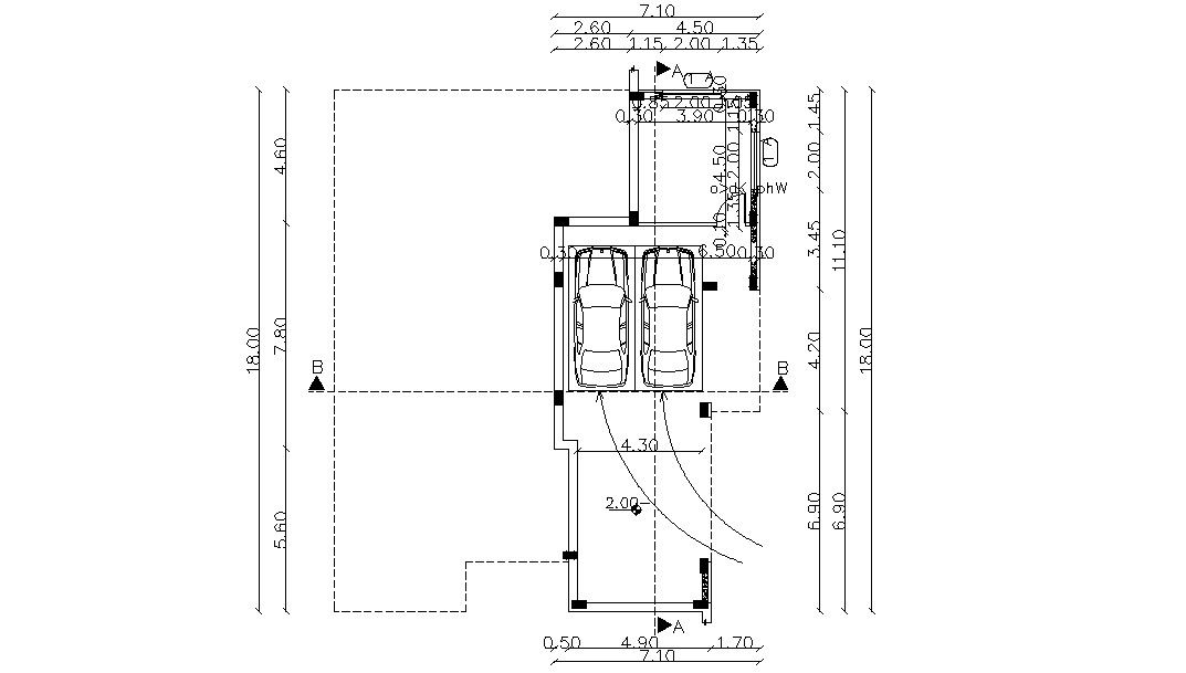 the residence house ground floor 2 Car parking space with floor plan design and column layout and dimension detail. download free car parking floor plan DWG file.