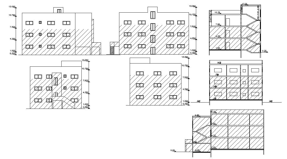 Residence G+2 Apartment layout elevation and sectional view CAD file that shows living apartment all sides of elevation design like front elevation, sides elevation and rear elevation along with apartment sectional details, floor leveling, and various other units details. Download the apartment section and elevation CAD file.