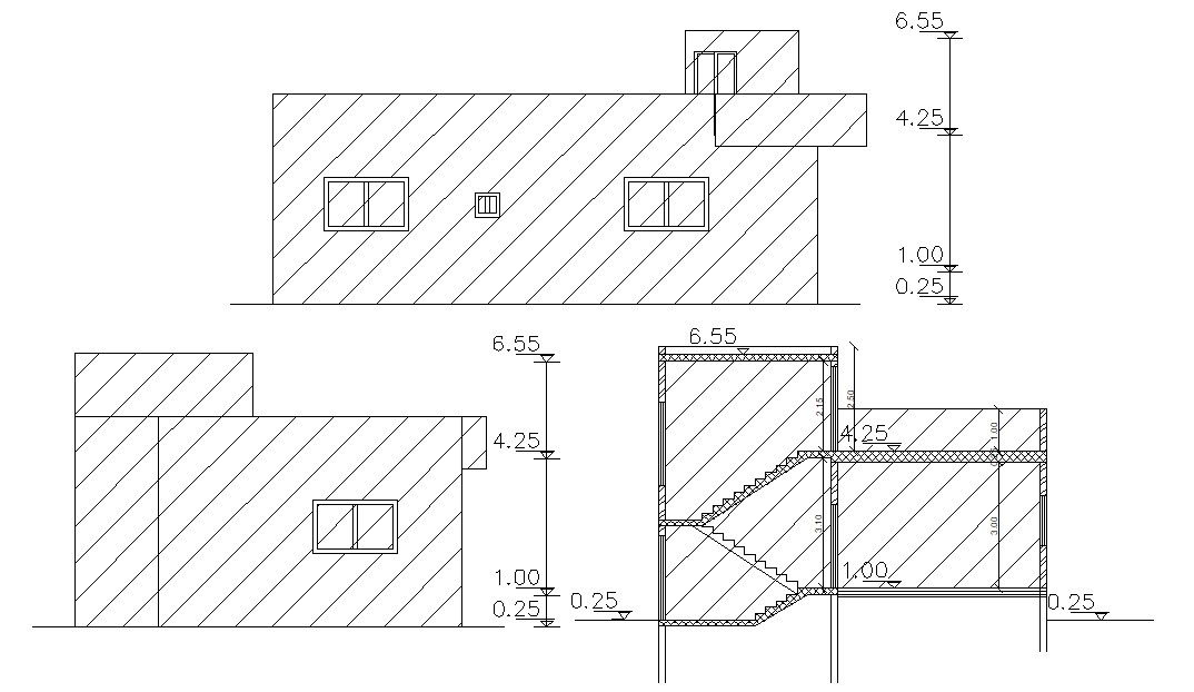 2 BHK residence house building sectional elevation design with dimension detail. download single storey small house building design DWG file.