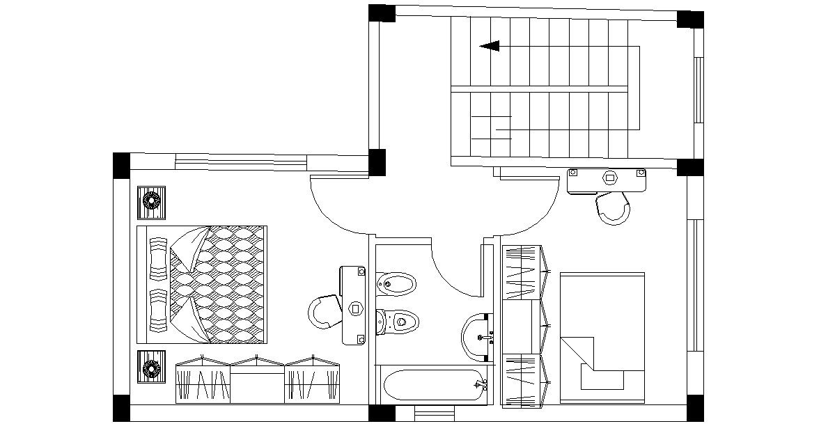 download free DWG file of residence house first-floor house furniture plan CAD drawing includes 2 bedrooms, toilet, and staircase with column layout plan design.