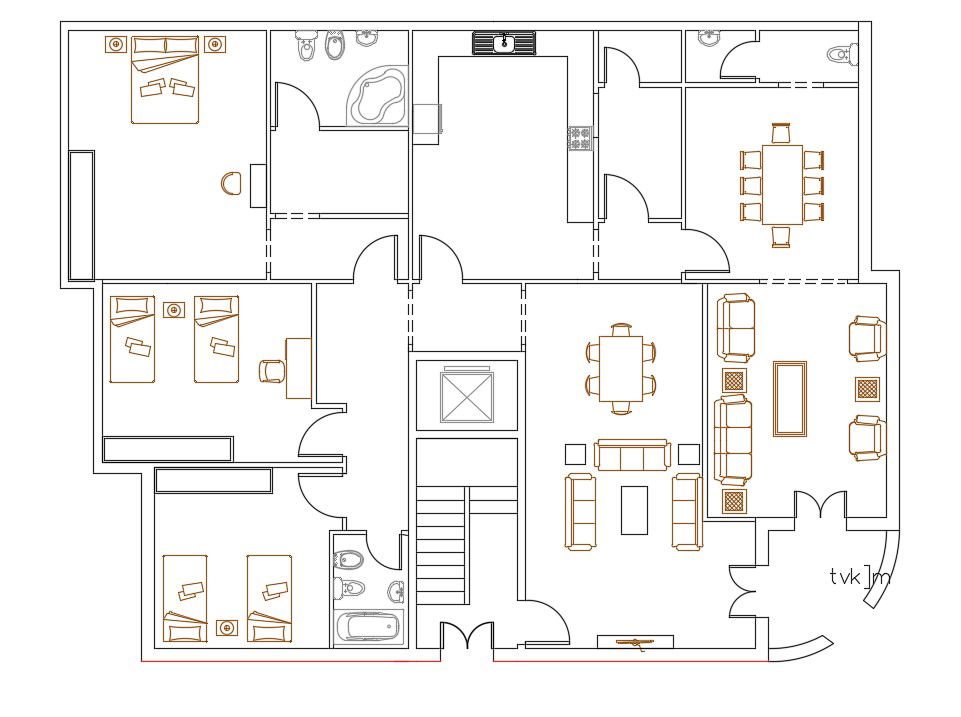 2d CAD drawing of residence house furniture layout plan CAD drawing includes 3 bedrooms with 2 attached and one of the common toilet, modular kitchen, drawing room and living area with dining room. download lavish house furniture layout plan design DWG file.