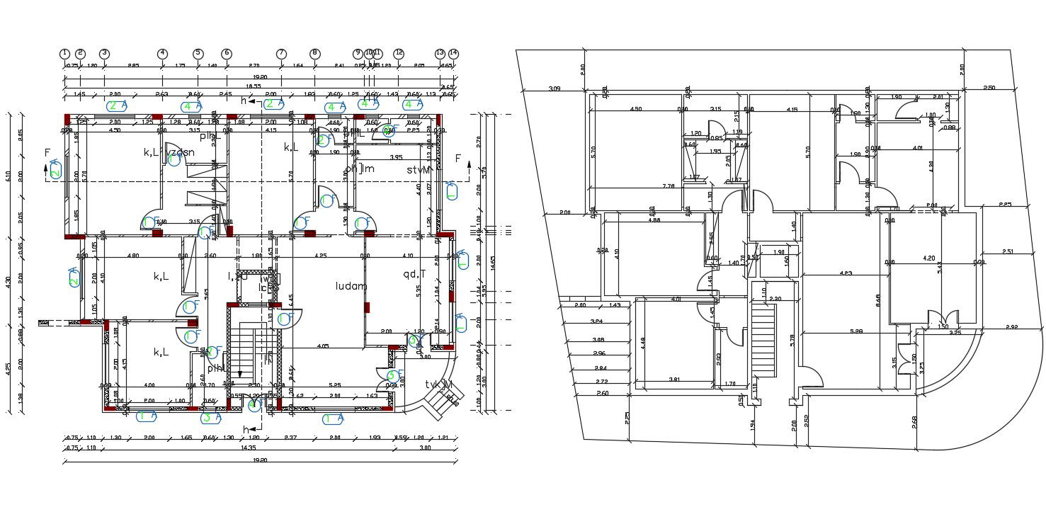 48 by 62 feet plot size for family house floor plan design with centre line plan and dimension detail. also has a column layout plan and wall thickness size detail. download architecture Vastu Shastra house floor plan design DWG file.