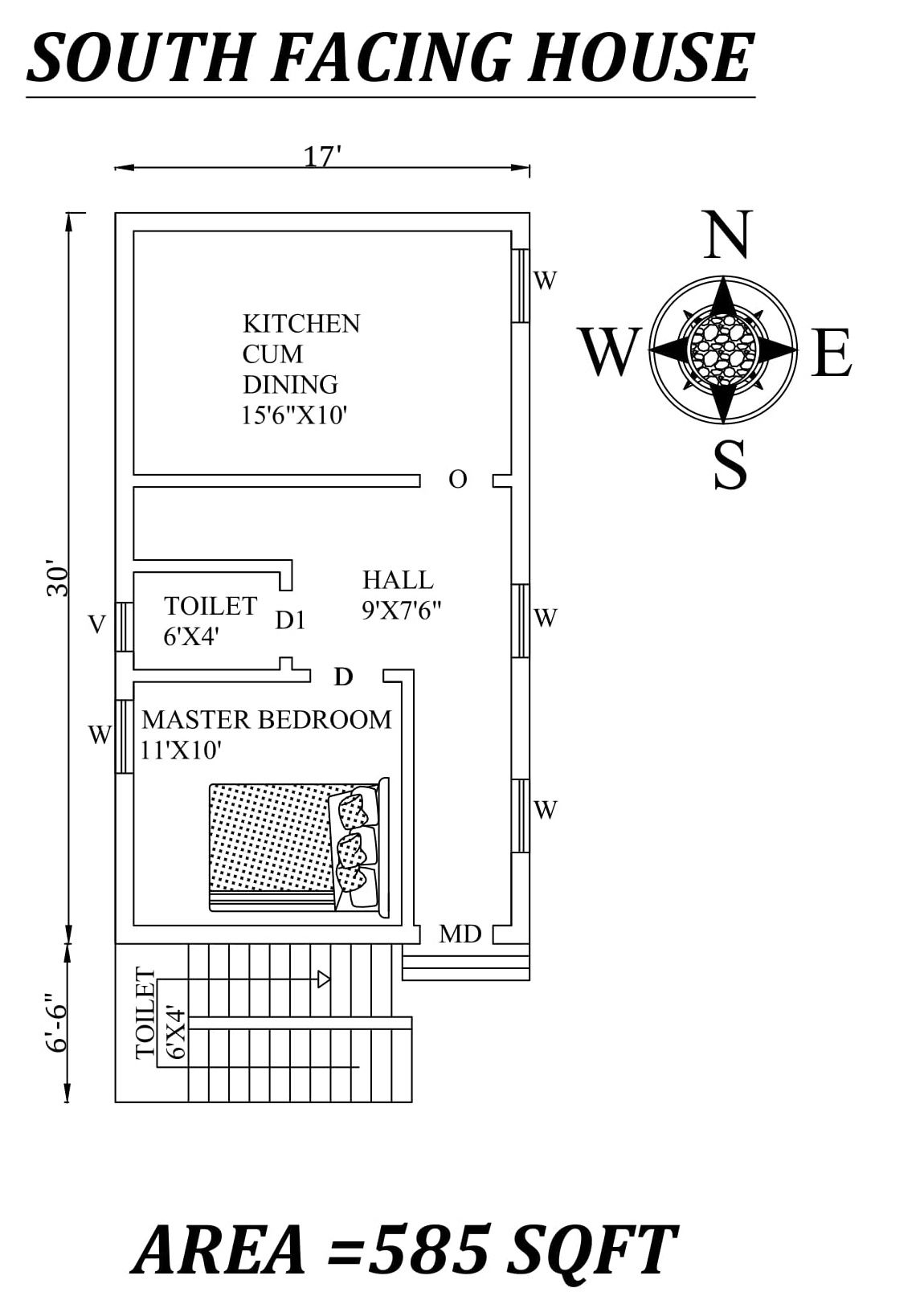 Autocad Drawing file shows 17'x30' South facing House Plan As Per Vastu Shastra. The total buildup area of this house is 585 sqft. The kitchen cum dining is in the North direction. The master bedroom is available in the southwest direction. The Common toilet is in the west direction. A staircase is available in the southwest outside of the house. The Hall is in the East Direction. The road is Available in the South direction. Download Autocad Drawing file and PDF file.