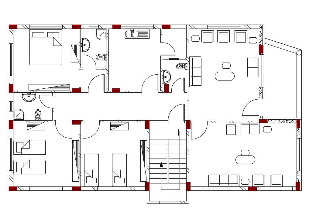 2d CAD drawing of residence house furniture layout CAD drawing includes 3 bedrooms, modular kitchen, drawing and living room also has a column layout plan. download house furniture plan design DWG file.