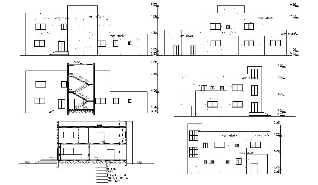 2d CAD drawing of 3 master bedrooms AutoCAD house building section drawing and elevation design with dimensions detail, download 2 storey modern house building design DWG file.