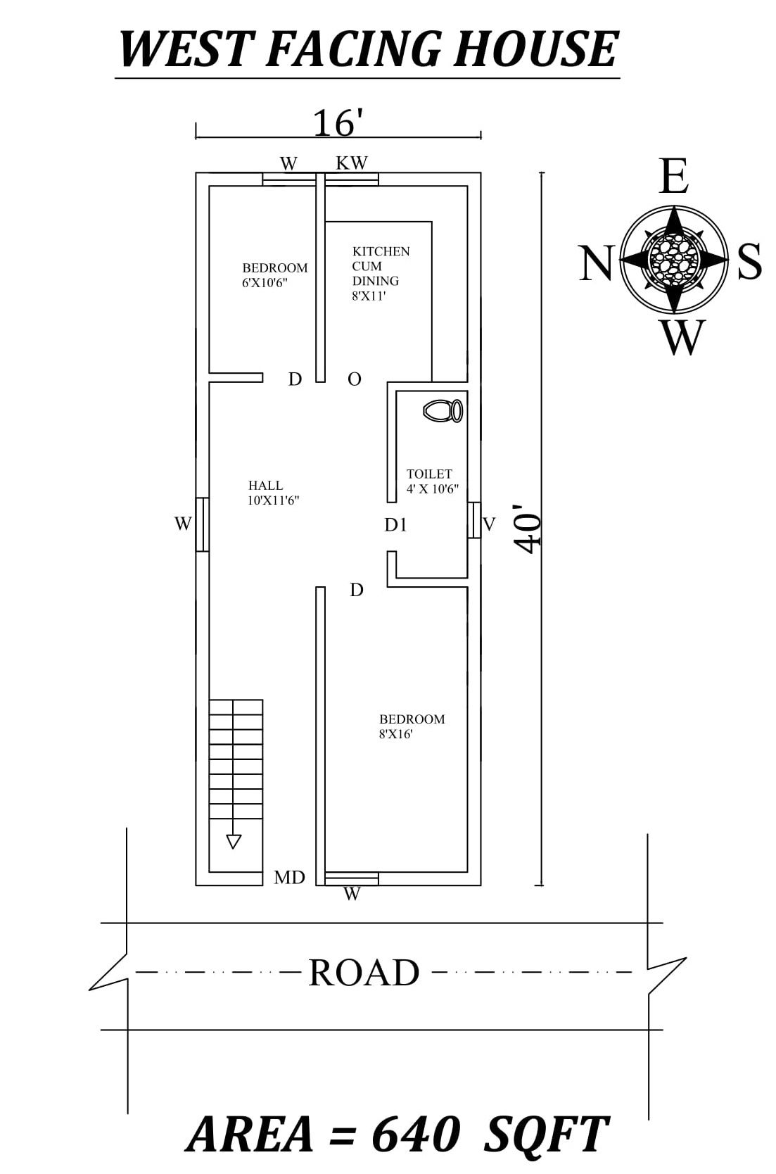 Autocad Drawing file shows 16'X40' 2 bhk West facing House Plan As Per Vastu Shastra. The total buildup area of this house is 640 sqft. The kitchen cum dining is in the Southeast direction. The Hall is available in the north direction. The Master bedroom is available in the Southwest direction. The Kids bedroom is in the northeast direction. The Common toilet is placed in the south. A staircase is available in the northwest inside of the house. The road is in the west. Download Autocad Drawing and PDF file.