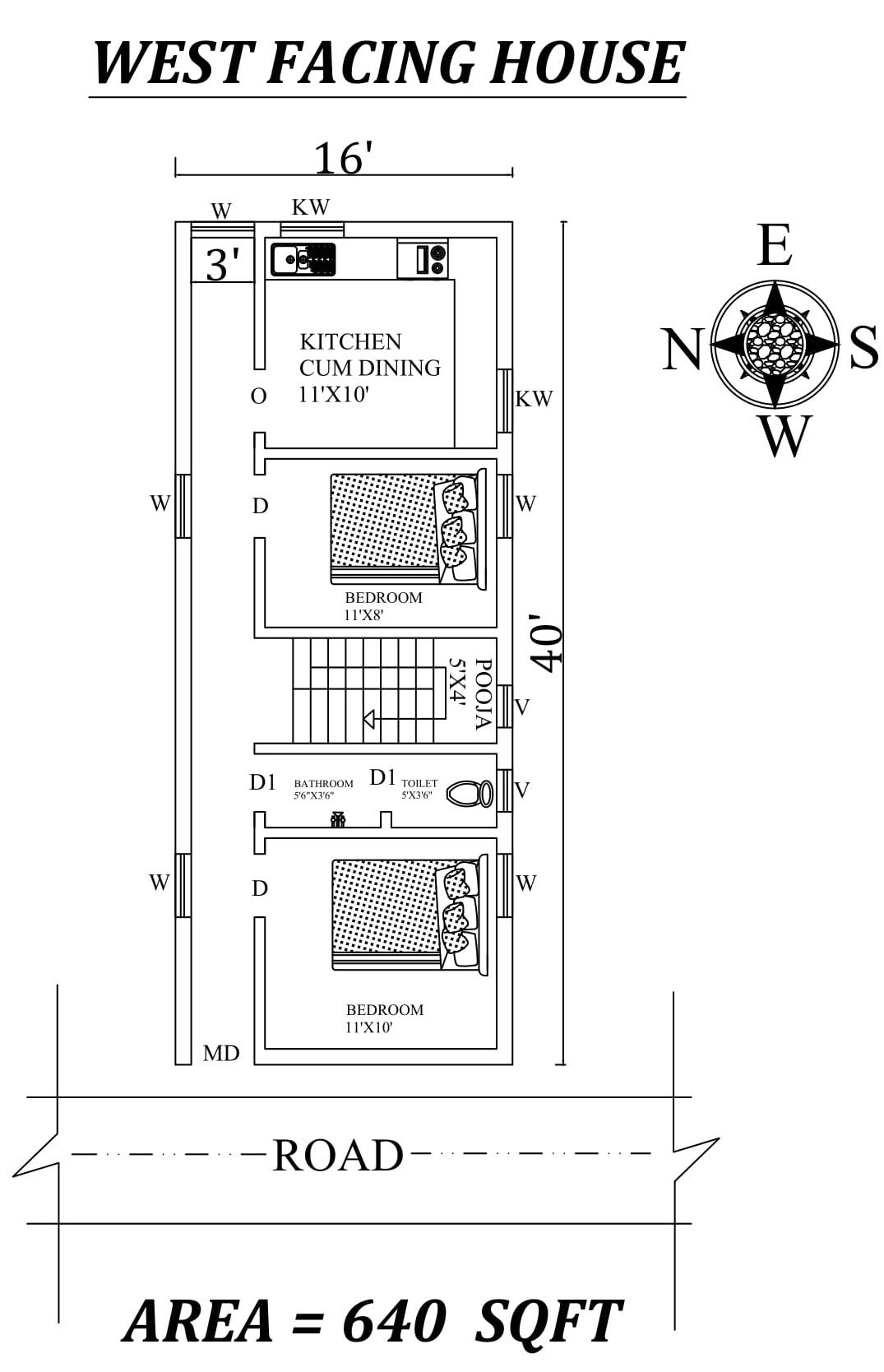 Autocad Drawing file shows 16'X40' 2 bhk West facing House Plan As Per Vastu Shastra. The total buildup area of this house is 640 sqft. The kitchen cum dining is in the Southeast direction. The Hall is available in the north direction. The Master bedroom is available in the Southwest direction. The Kids bedroom is in the south direction. The Common toilet is placed in the south. A staircase is available in the south inside of the house. The road is in the west. Download Autocad Drawing and PDF file.
