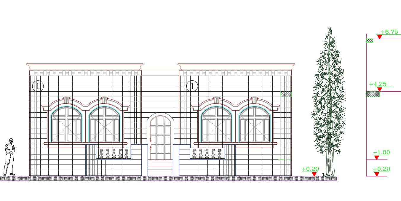 free download single storey modern front elevation design of the house building also has some AutoCAD hatching design to improve the CAD presentation.