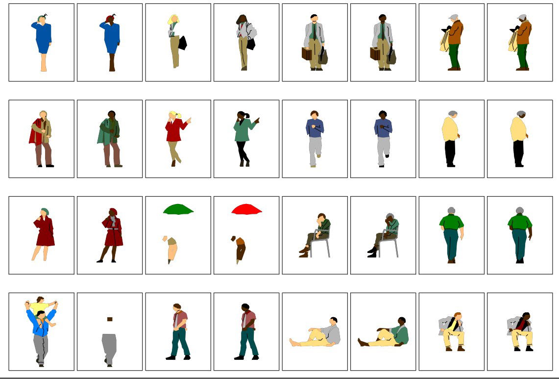 people cad Block AutoCAD hatching design Here you can fine a large amount of people from all kinds men women colored black-white shaded caricature upper view fill free download file for DWG file