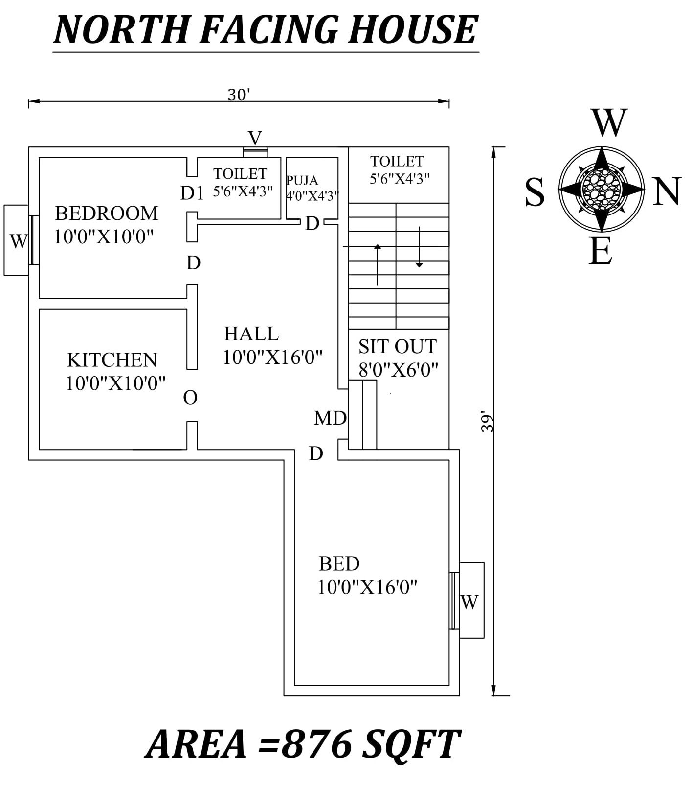 AutoCAD DWG file shows 30'x39' Amazing North facing 2bhk house plan as per Vastu Shastra. The Buildup area of this house plan is 876 sqft. The master bedroom is in the southwest direction with the attached toilet in the West and the children's bedroom is in the northeast direction.kitchen is placed in the southeast. Hall is available in the northeast direction. Puja room available in the west direction. Staircase placed in the northwest direction outside of the house. Download Autocad DWG and PDF file format of this house.