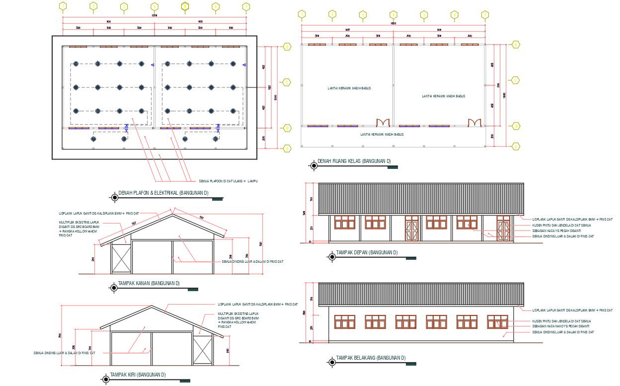 2d CAD drawing of residence house ground floor plan, electrical layout plan, section and elevation design with dimension detail. download struss roof duplex house project DWG file.