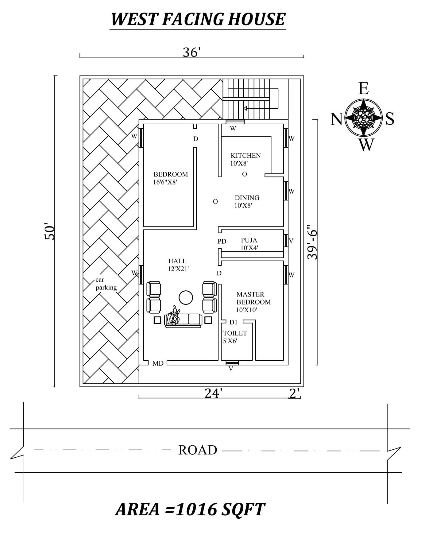 Autocad Drawing file shows 36'x50' Marvelous 2bhk West facing House Plan As Per Vastu Shastra. The total buildup area of this house is 1016 sqft. The kitchen is in the Southeast direction. Dining is in the South Direction. The Hall is Placed in the Northwest direction of the house. The master bedroom available in the southwest direction with the attached toilet is in the west direction. kid's bedroom is in the Northeast direction. Puja room is in the south direction. A staircase is available in the southeast outside of the house. A common toilet is available under the staircase. Portico/car parking is available in the north direction of the house. Download Autocad Drawing file and PDF file.