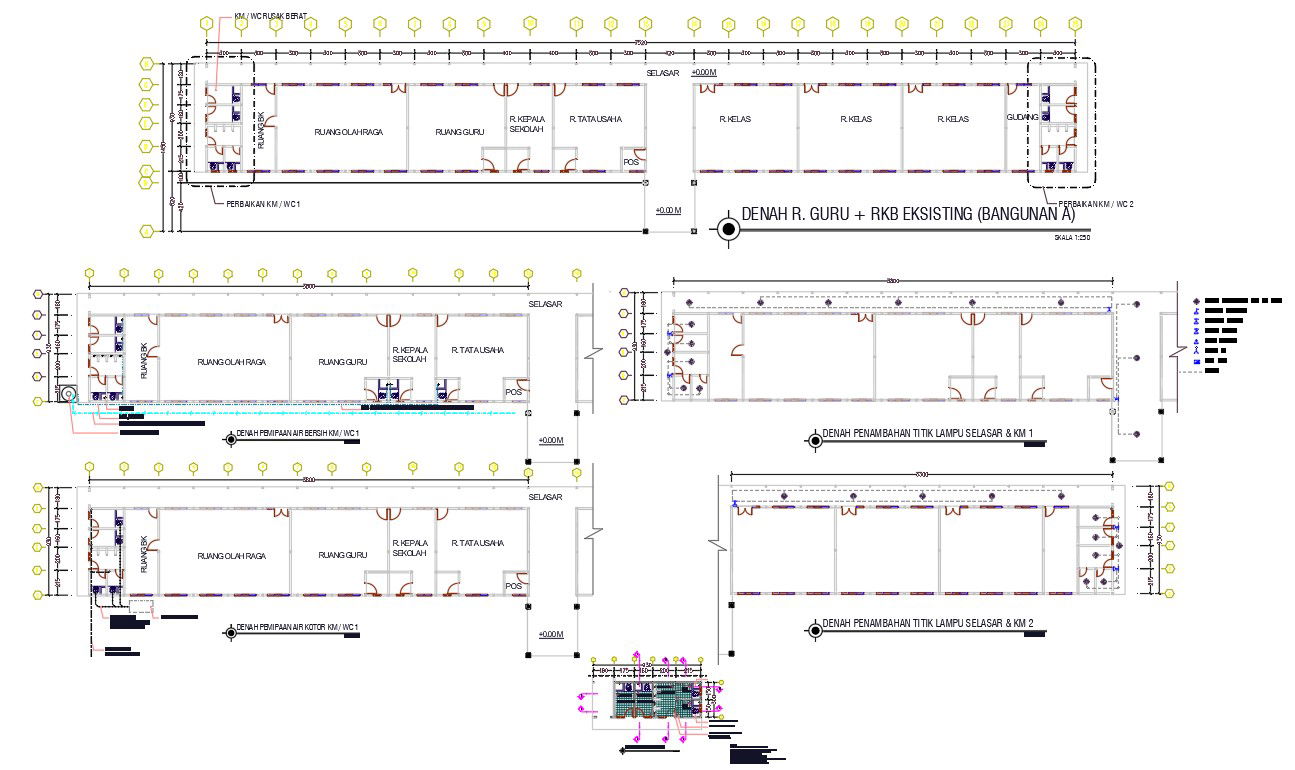2D CAD drawing of school project design includes floor layout plan with dimension detail and center line plan design DWG file. download school plan with toilet AutoCAD file.