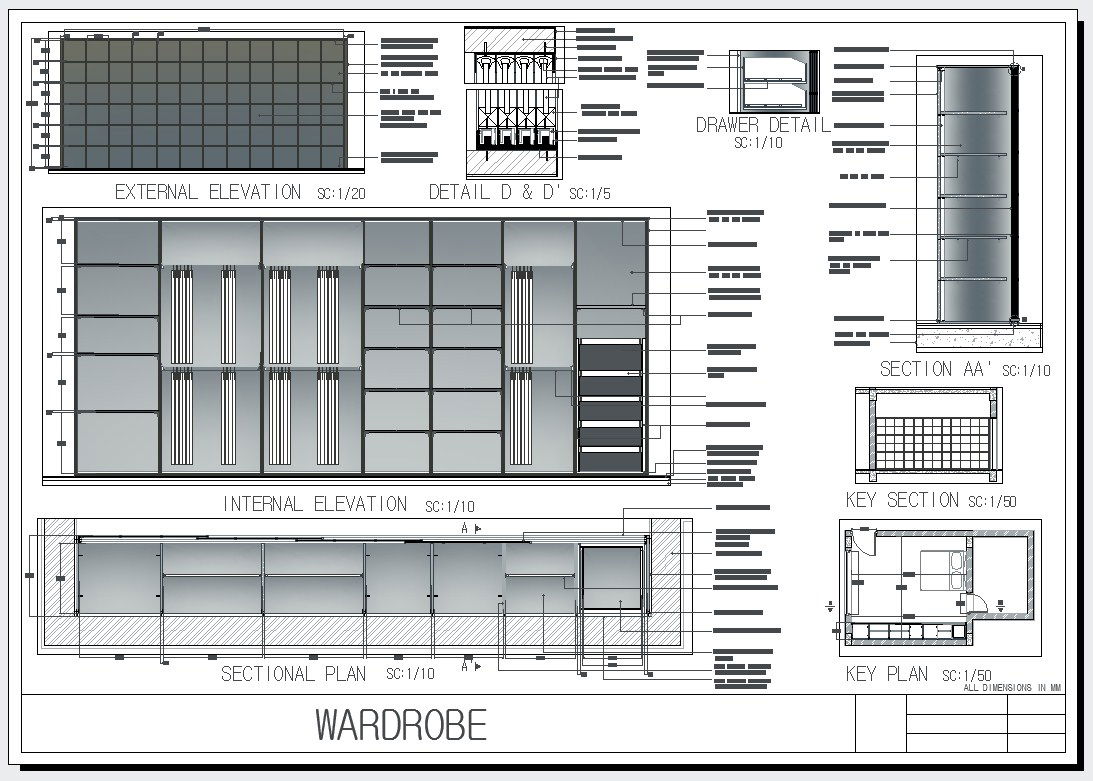 modern furniture and detailing of wardrobe and cupboard. wardrobe elevation & section , plan detail.