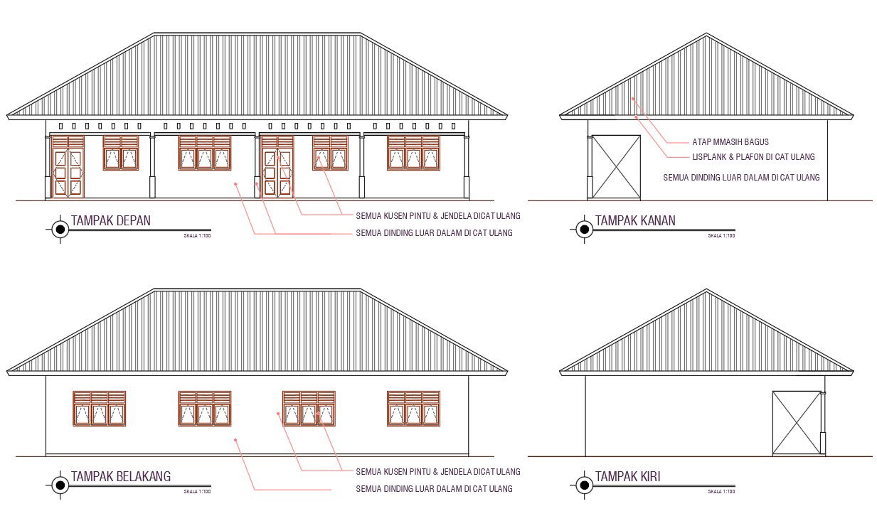 The single storey residence house building elevation design in all side that shows truss span roof, door and window marking detail. download span roof house building design DWG file.