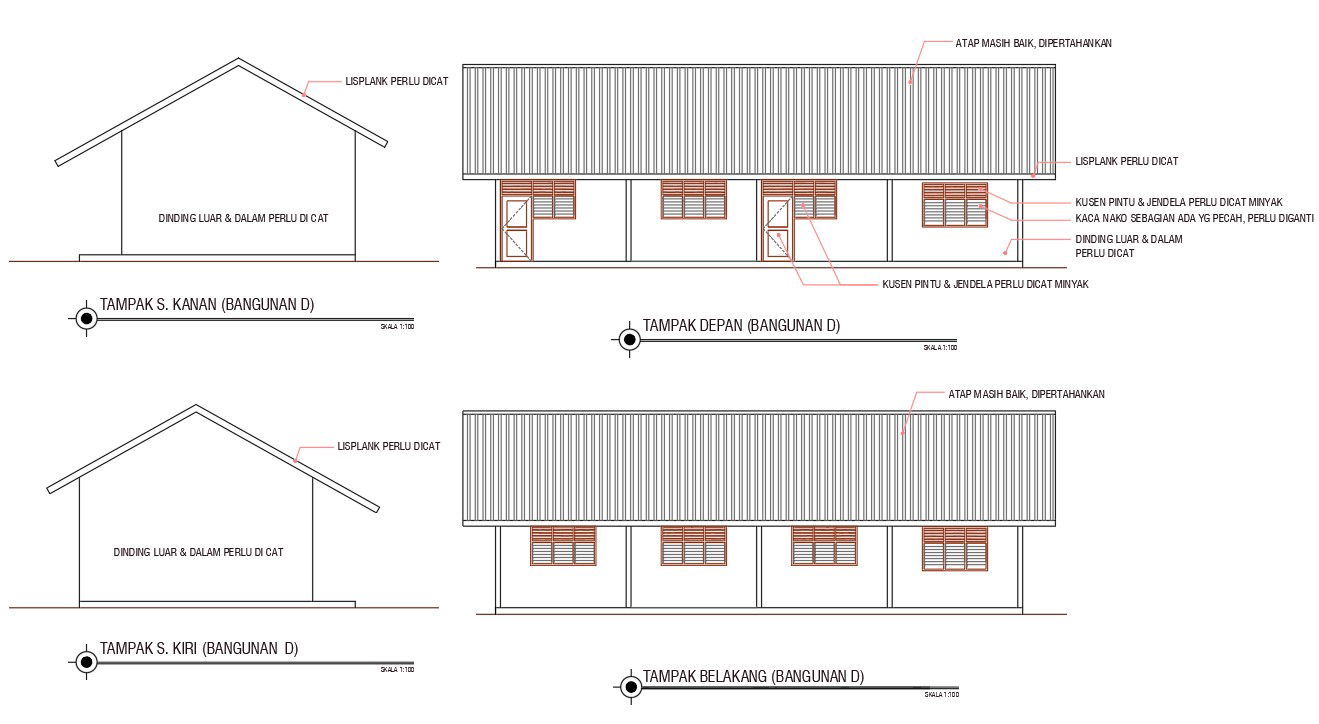 The twin house building all side elevation design that shows long span roof design, door and window marking detail. download truss span roof house building design AutoCAD file.