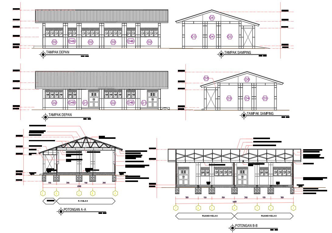 2D CAD drawing of residence single storey house building section drawing and elevation design with dimension detail that shows long span roof structures, column footing foundation and door window marking detail. download truss roof house building design DWG file.