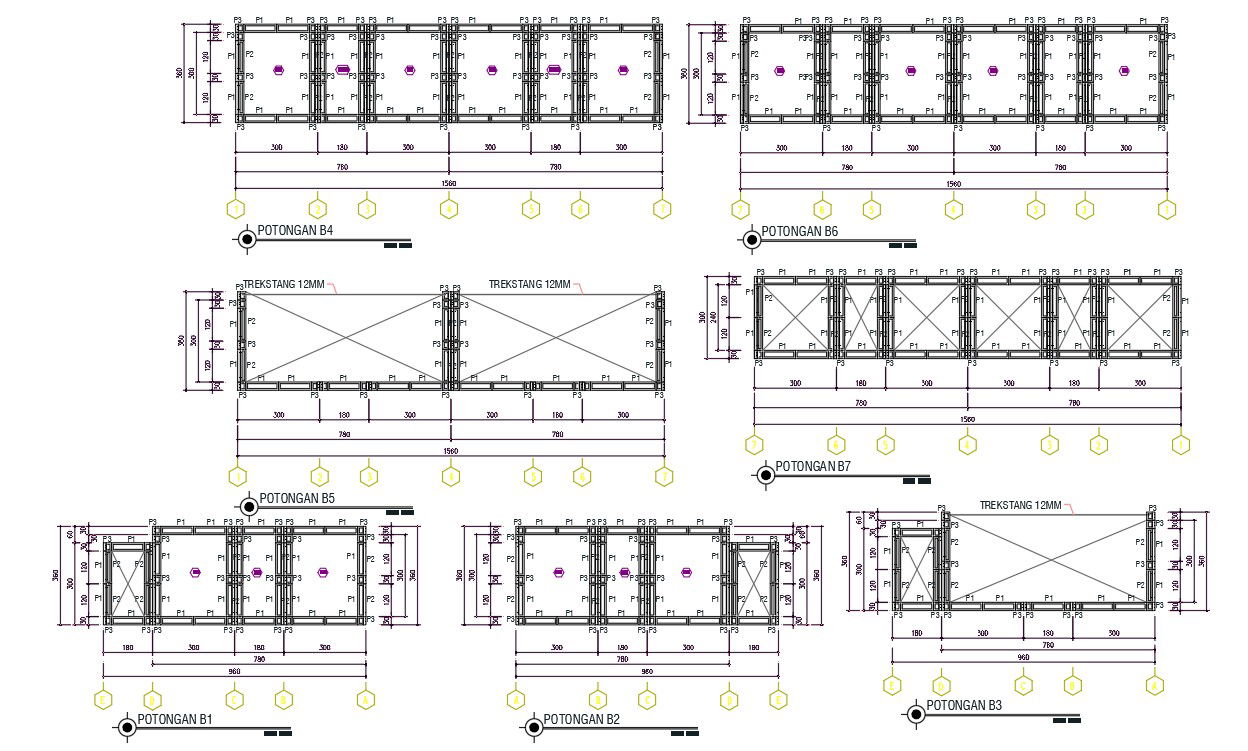 AutoCAD drawing free download DWG file of potongan plan design with center line and dimension detail. also has different side view design.