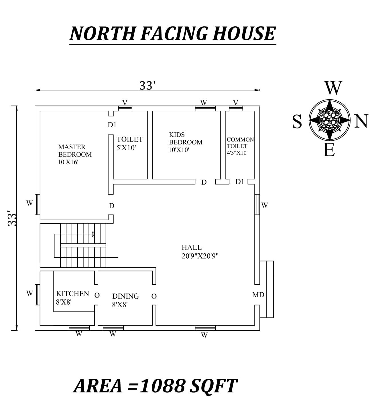 This AutoCAD DWG file presents a meticulously designed 33x33 North-facing 2BHK house plan, adhering to Vastu Shastra principles. The layout includes a master bedroom in the southwest with an attached toilet in the west, a children's bedroom in the west, a common toilet in the northwest, a kitchen in the southeast, a dining room in the east, a hall in the northeast, and a staircase in the south. The total built-up area is 1088 sqft, making it ideal for small families seeking a Vastu-compliant home. The DWG and PDF files provide detailed measurements for accurate construction and planning.