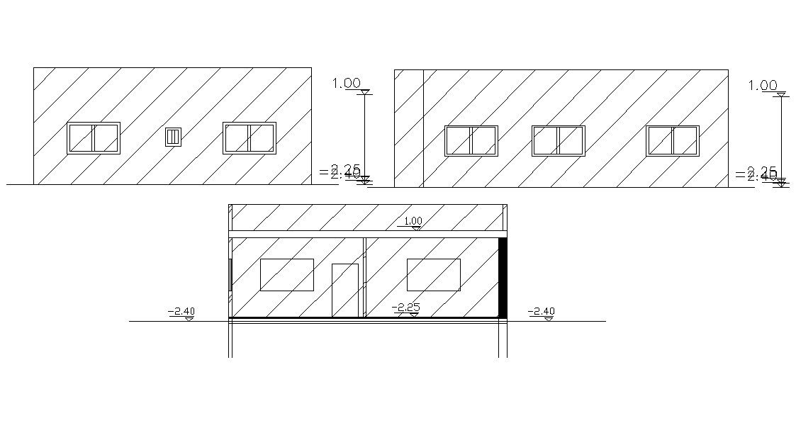 One storey elevation layout provide plinth level 0.25 meter, floor level, hatching, door and windows details. this is drawing download AutoCAD file.