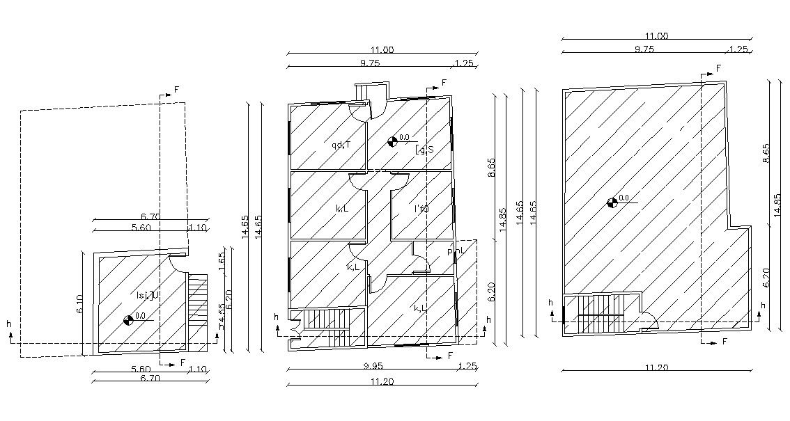 2d drawing ground floor and terrace floor plan include staircase, washroom, kitchen, toilet, living area and plan size is 11.20 X 14.65 meter. download AutoCAD format.