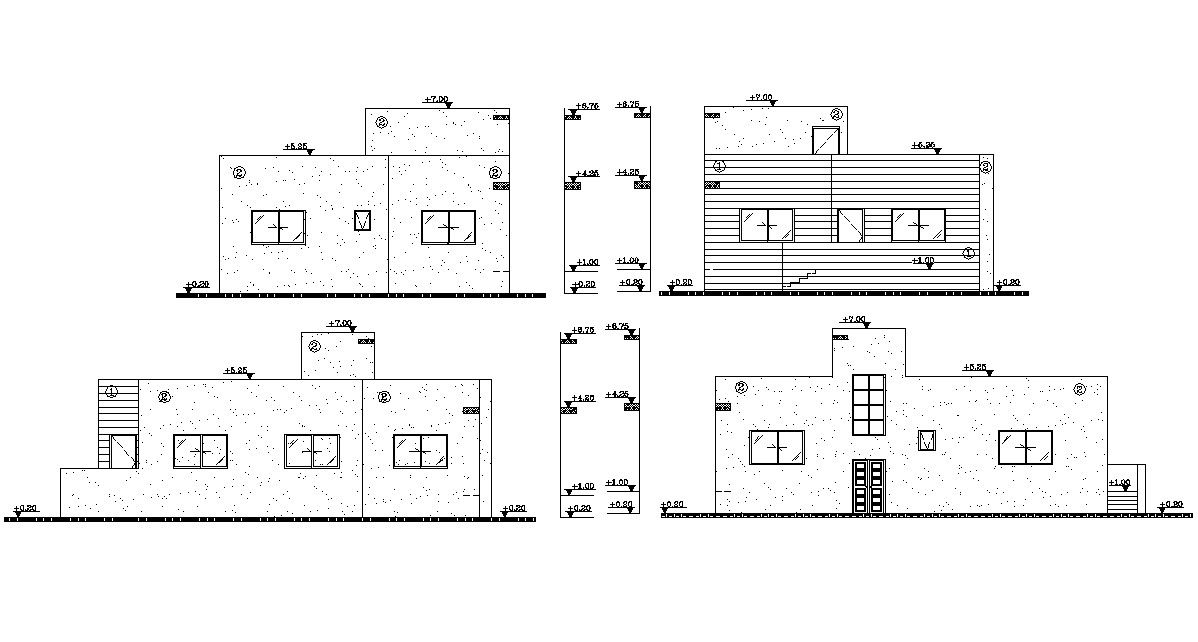 2d drawing given a details of elevation and section in doors and windows, floor level, parapet wall and other details. and also floor level is 0.20 meter and full elevation height is 7.0 meter. download AutoCAD file.