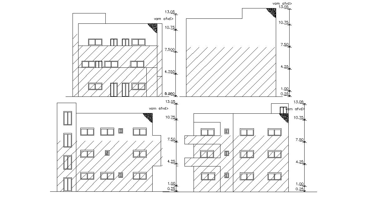 2d drawing provide a doors and windows, hatching, floor level and other details. this drawing include floor level is 0.25 meter and elevation height is 13.05 meter. download AutoCAD format file.